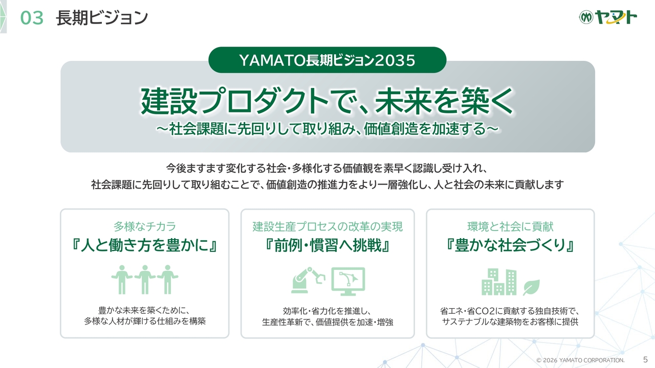 YAMATO長期ビジョン2035は、「建設プロダクトで、未来を築く」です。社会課題に先回りして取り組み、価値創造を加速します。