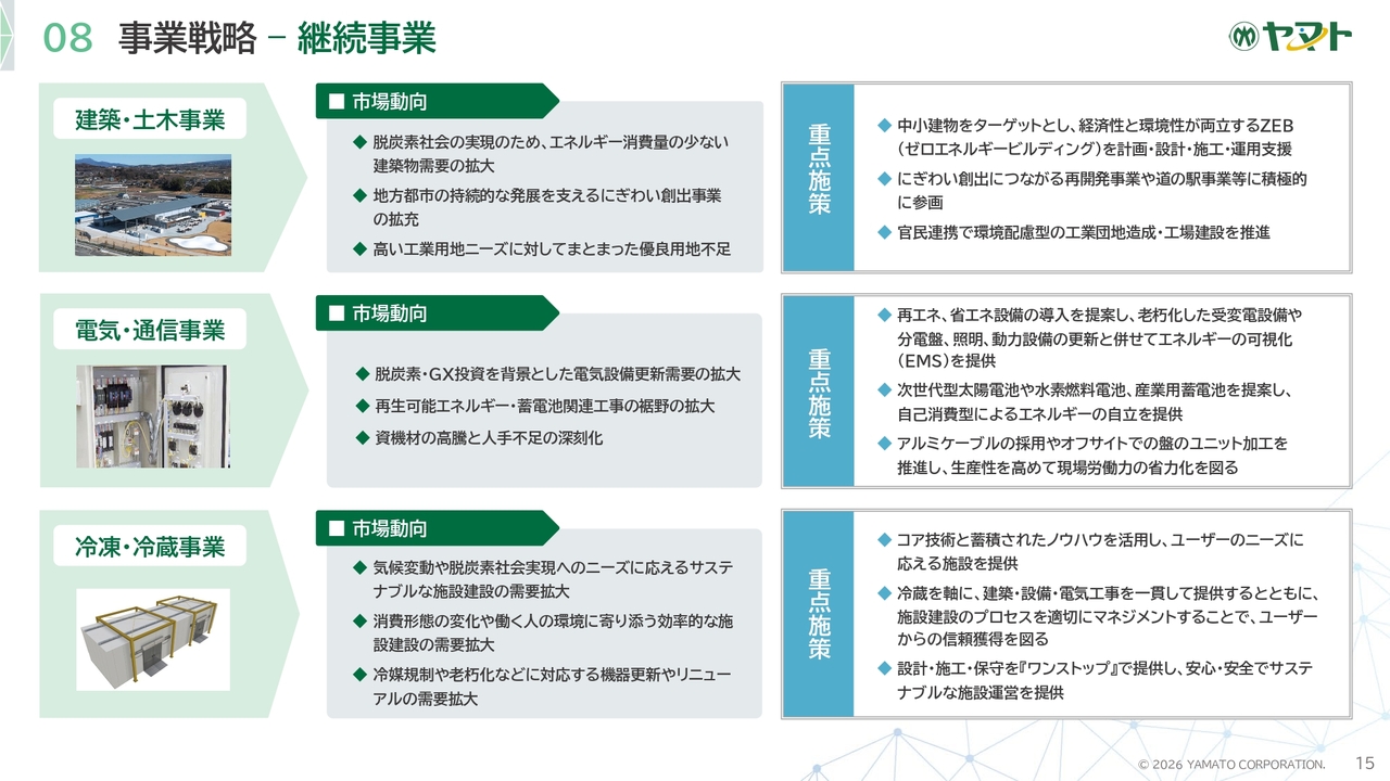 継続事業となる建築・土木事業、電気・通信事業、冷凍・冷蔵事業は市場動向に合わせて拡大を推進します。
