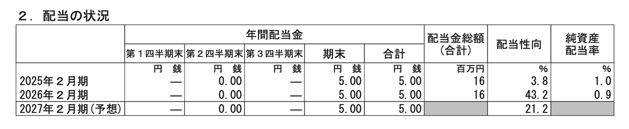 2026年2月期は、年間配当金5.00円、配当金総額1,600万円、配当性向43.2パーセント、純資産配当率0.9パーセントを予定しています。