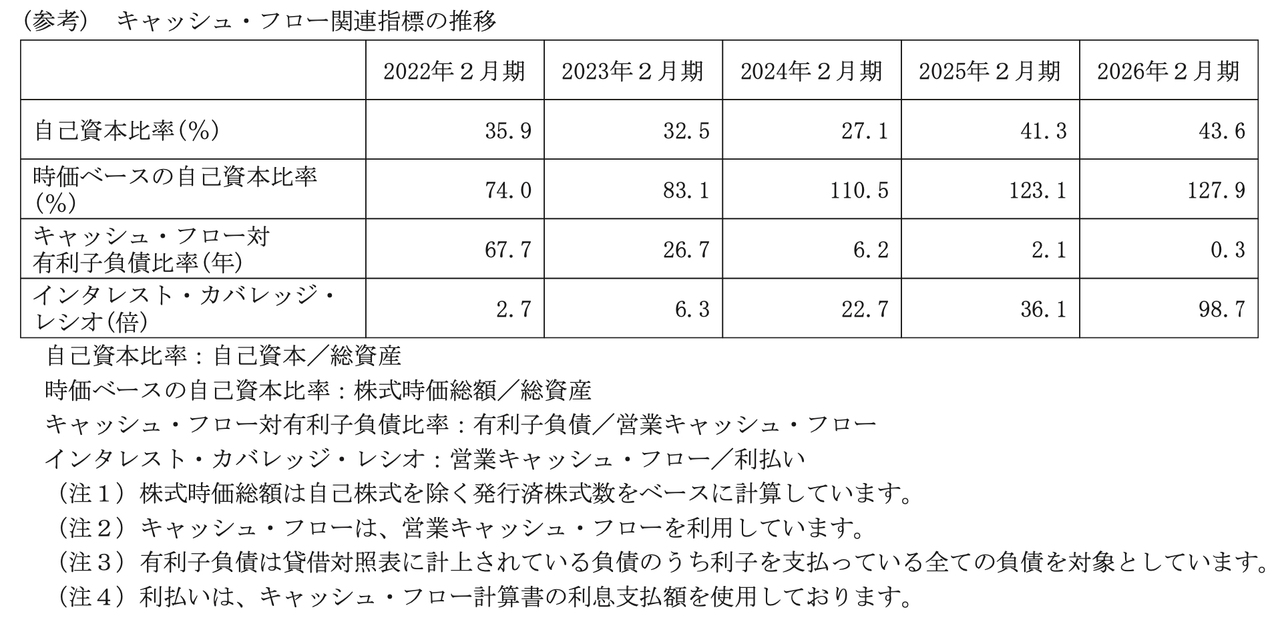 さらに、キャッシュ・フロー対有利子負債比率は、2025年2月期の2.1年から0.3年へと短縮し、インタレスト・カバレッジ・ レシオについても、36.1倍から98.7倍へと大きく上昇しており、財務の健全性が一段と高まっています。