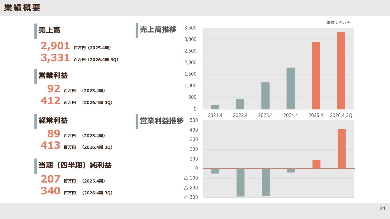 業績の概要です。スライドには、着地の数値を記載しています。2025年4月期は約1.6倍の成長を記録し、2026年4月期も約1.5倍の成長が見込まれる着地予想となっており、引き続き高い成長を続けています。