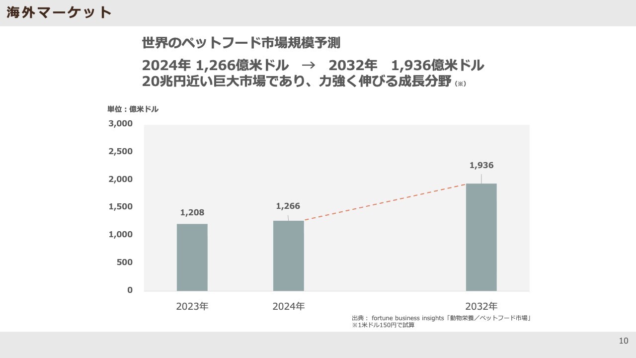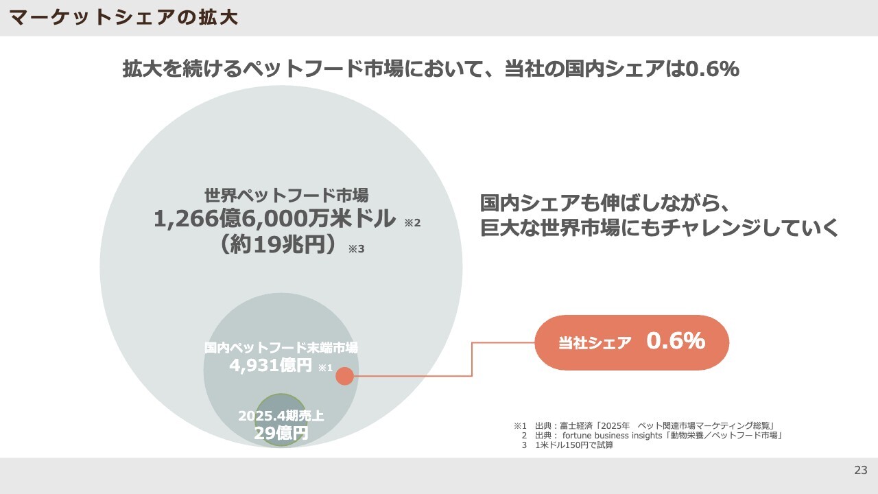 海外マーケットについてです。昨年は台湾への進出も果たしましたが、世界全体のペットフード市場は約20兆円と非常に規模が大きく、日本の約40倍に当たります。日本でわんちゃんや猫ちゃんと暮らす世帯の割合は約20パーセントで、世界的に見ると非常に低い水準です。