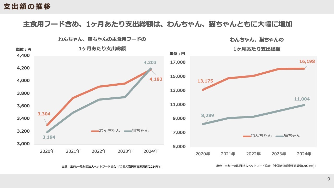 近年は、1頭あたりの支出金額が増加しています。お客さまがわが子(ペット)に、より良い商品やサービスを求める傾向が強まった結果、1頭にかける金額が増えている状況です。