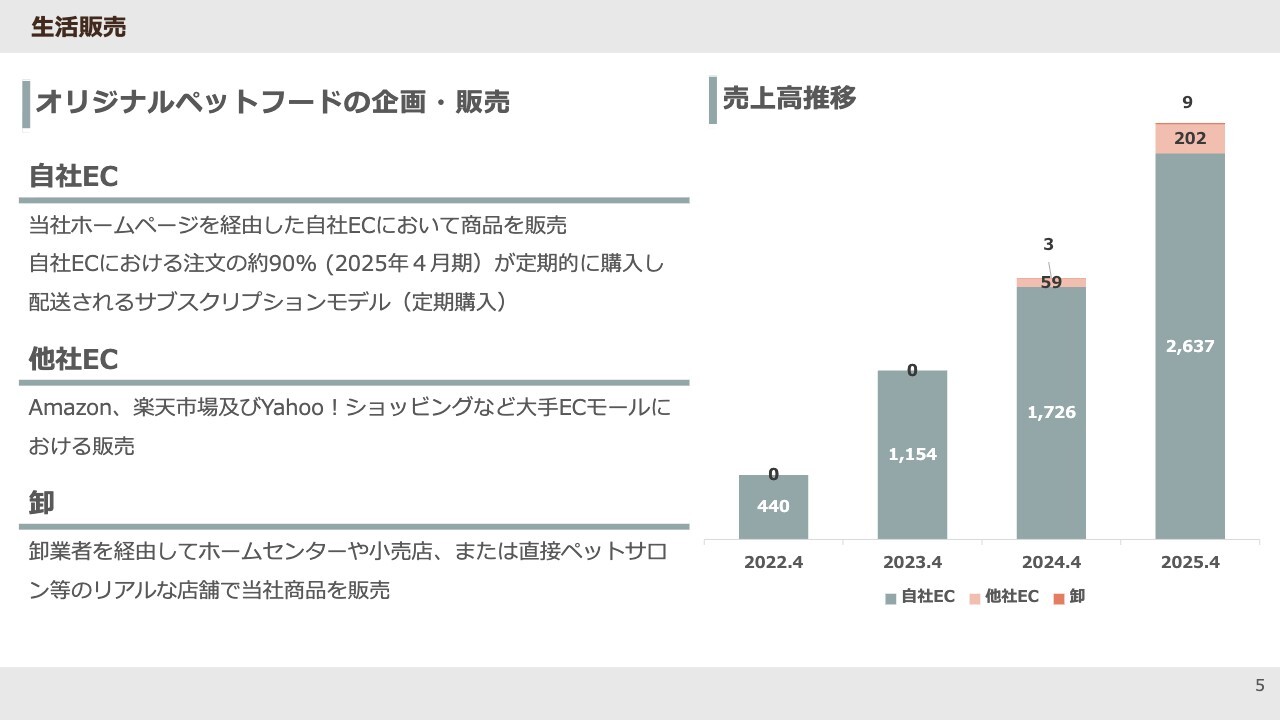 特徴としては、自社ECが中心で、そのうち注文の約90パーセントが定期購入となっている点が挙げられます。わんちゃん、猫ちゃんと一緒に暮らしている方は想像しやすいかもしれませんが、ペットフードは基本的に、決まったものを決まった量食べていく性質があります。
