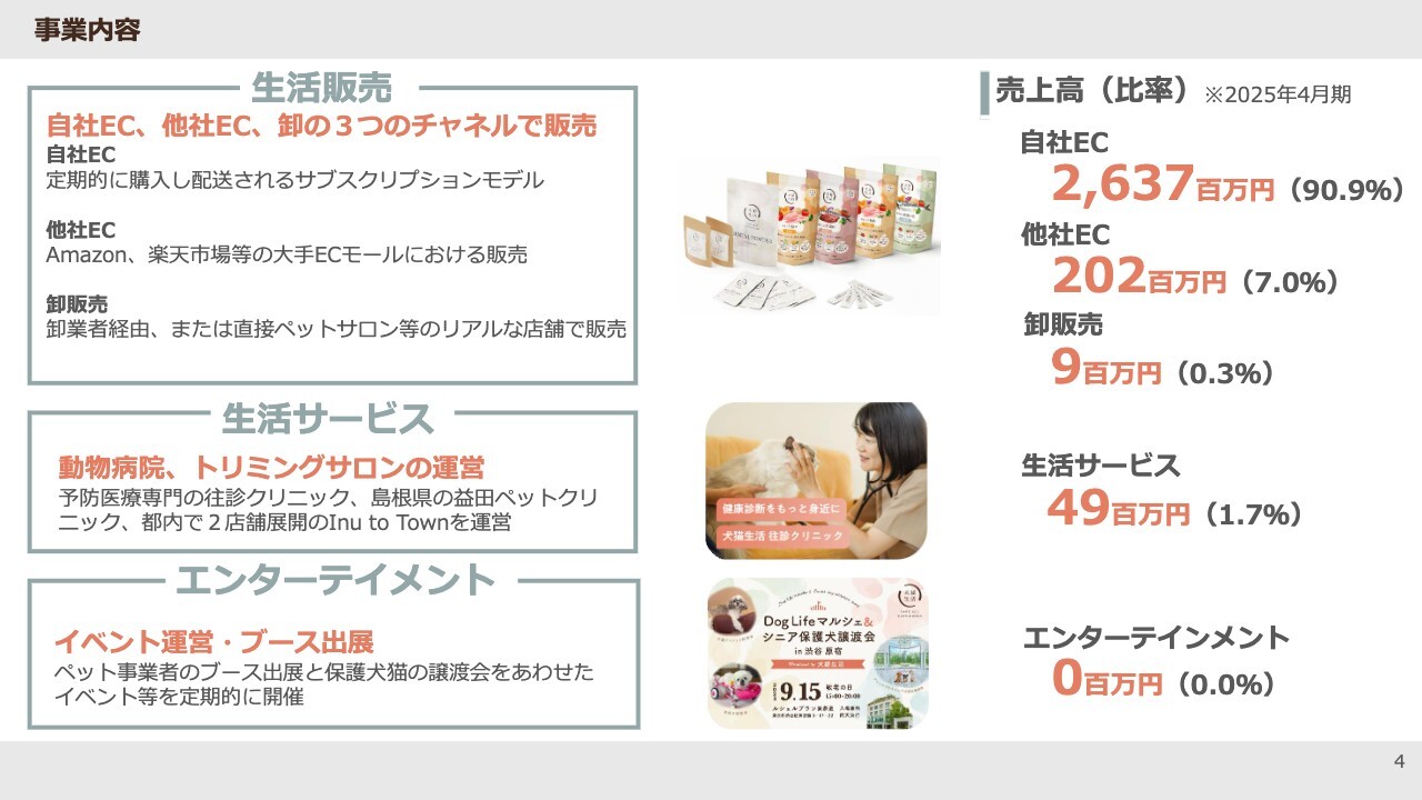 事業は大きく分けて3つ展開しています。1つ目は生活販売事業で、ペットフードの販売を行っています。創業以来続く事業で、現在も弊社事業の中心となっています。2つ目は生活サービス事業、3つ目はエンターテインメント事業です。