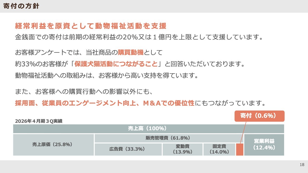 財団のガバナンスの観点も考慮し、現金給付は1億円を上限としつつ、他団体も含めフードの寄付なども行っています。現金とフードの寄付の合計を、前期経常利益の20パーセントに合わせるかたちで寄付を実施しています。