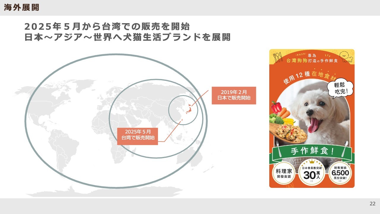 もう1つの大きな部分は、海外展開です。昨年5月から台湾でテスト販売を開始しました。まずは1商品でスタートしましたが、かなり手応えを感じています。そのため、来期からは台湾国内への本格的な展開と、別の国への進出について検討を進めていきます。