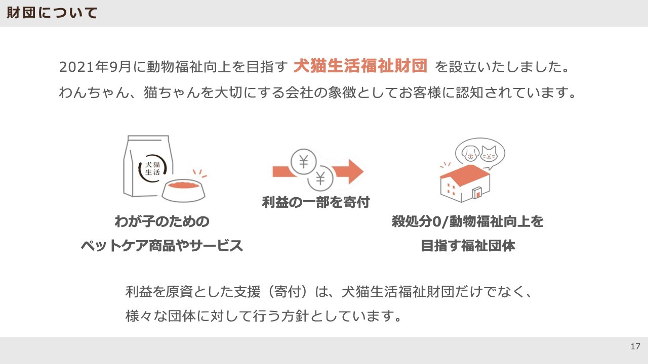 ペット業界の現状と戦略についてご説明します。弊社の大きな特徴であり、主要な戦略の1つとして、動物福祉の向上を目的とする「犬猫生活福祉財団」を設立しました。この財団は非営利の財団法人で、弊社が設立人となり設立しています。