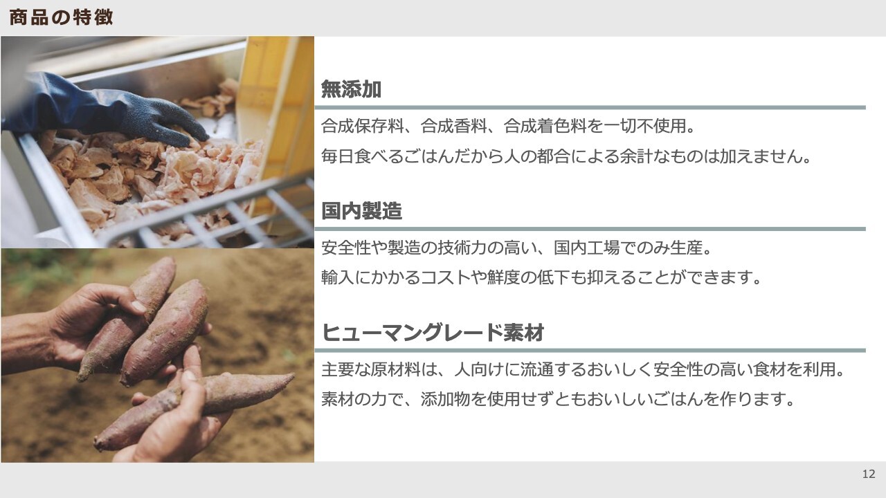 スライドの写真は、ドライフード工場の様子を映したものです。弊社はいわゆるOEM形式で商品を製造していますが、ドライフードについてはOEM先に弊社専用の工場を作っていただいています。