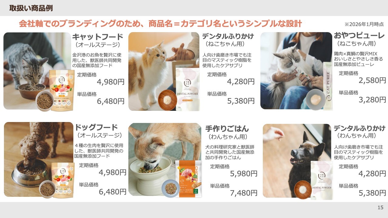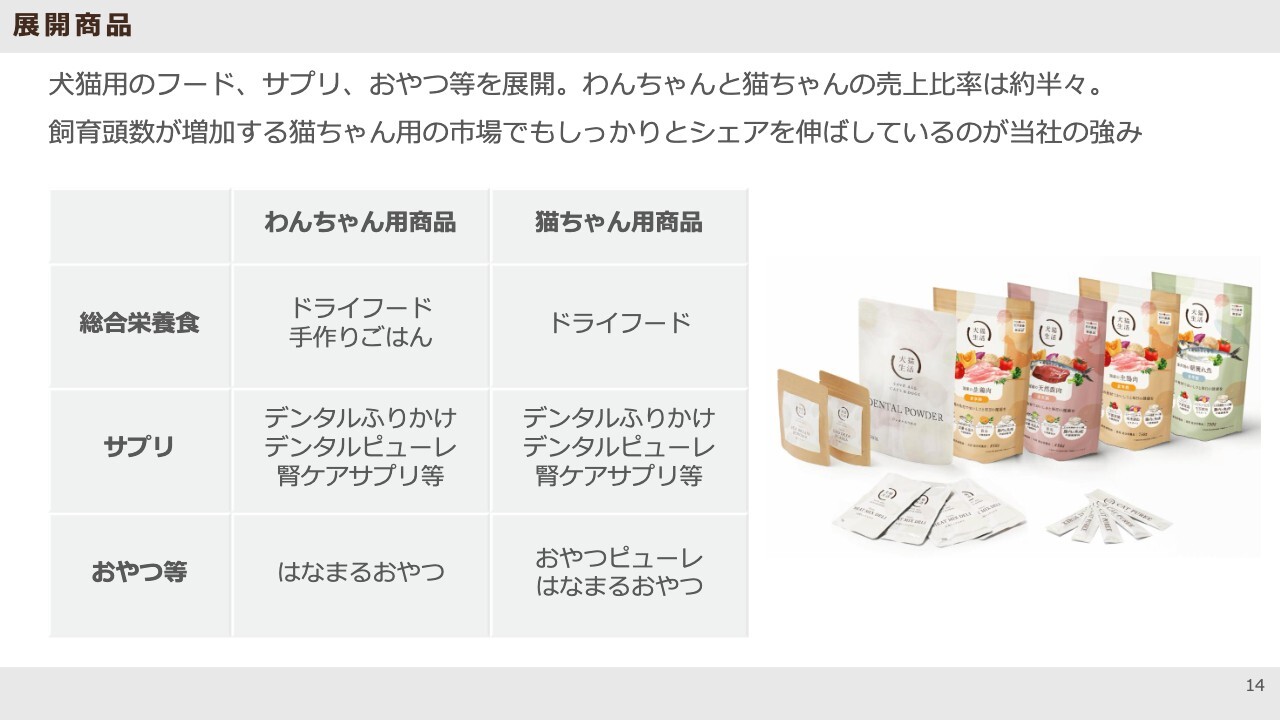 商品展開についてです。わんちゃん用、猫ちゃん用の商品を幅広く展開しており、売上比率はほぼ半々で、バランスよく推移しています。