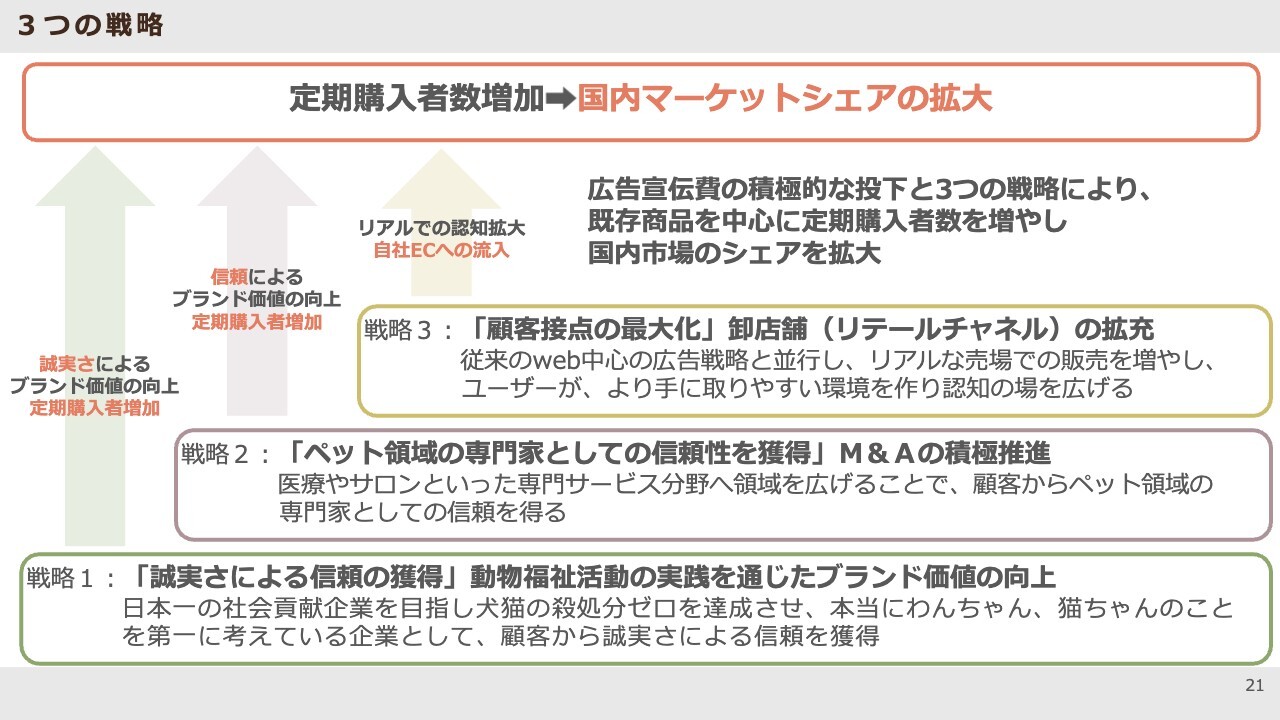 戦略1は、先ほどご説明した財団、動物福祉活動への寄付を通じて、「誠実さによる信頼の獲得」を目指すものです。これは、「この会社なら、わんちゃんや猫ちゃん、うちの子たちのことを第一に考え、安心できるフードを作ってくれる」といった信頼性を指しています。