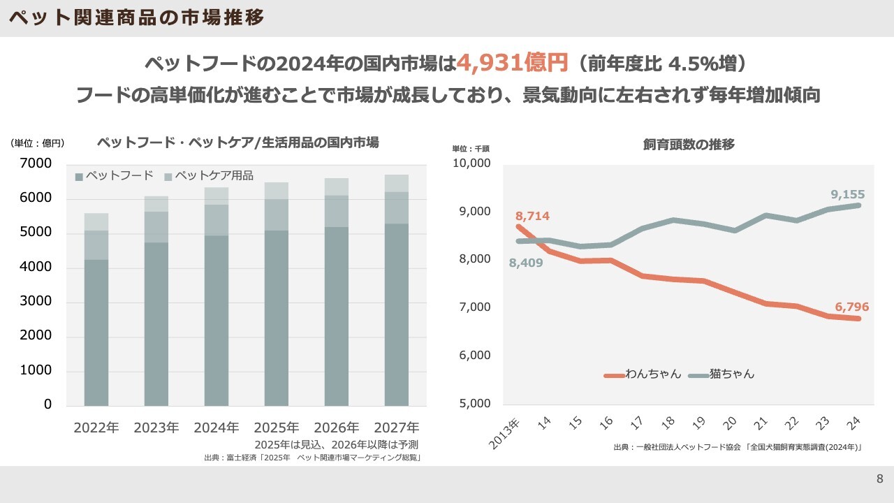 市場環境についてご説明します。スライドに記載のとおり、ペットフードの市場規模は約5,000億円です。現在は子どもの数よりもペットの数のほうが多い時代となっており、市場はかなりの規模となっています。