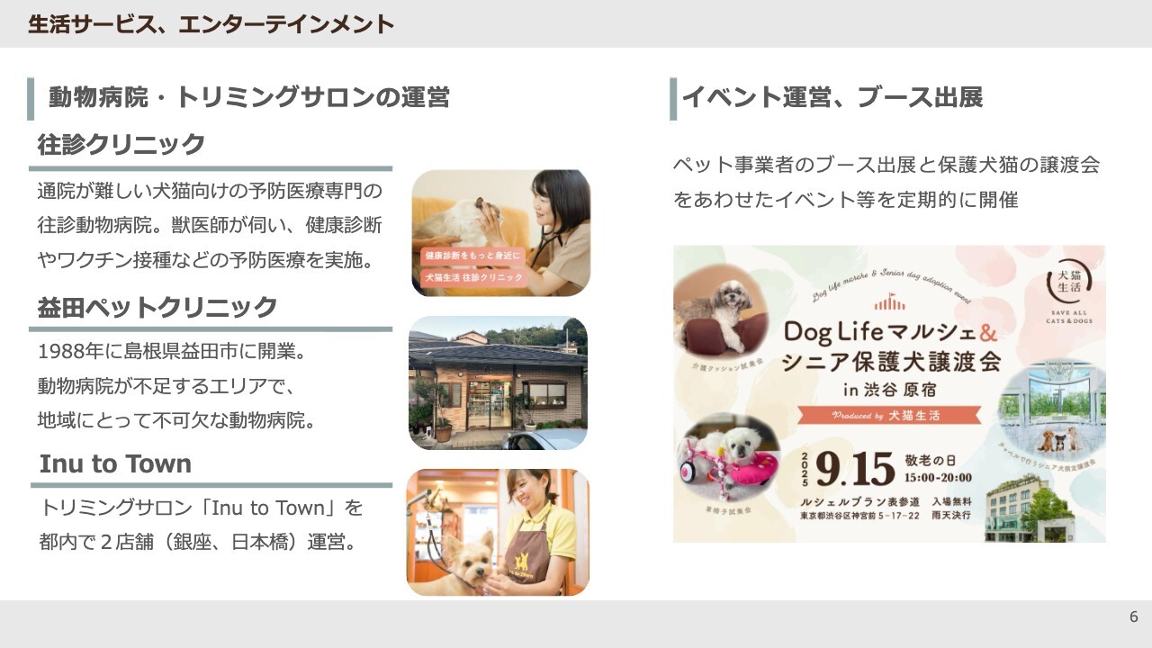 生活サービス事業についてです。スライド左側に記載のとおり、この事業は動物病院とトリミングサロンの2つに大きく分けられます。特に動物病院には、さらに2つのサービスがあります。