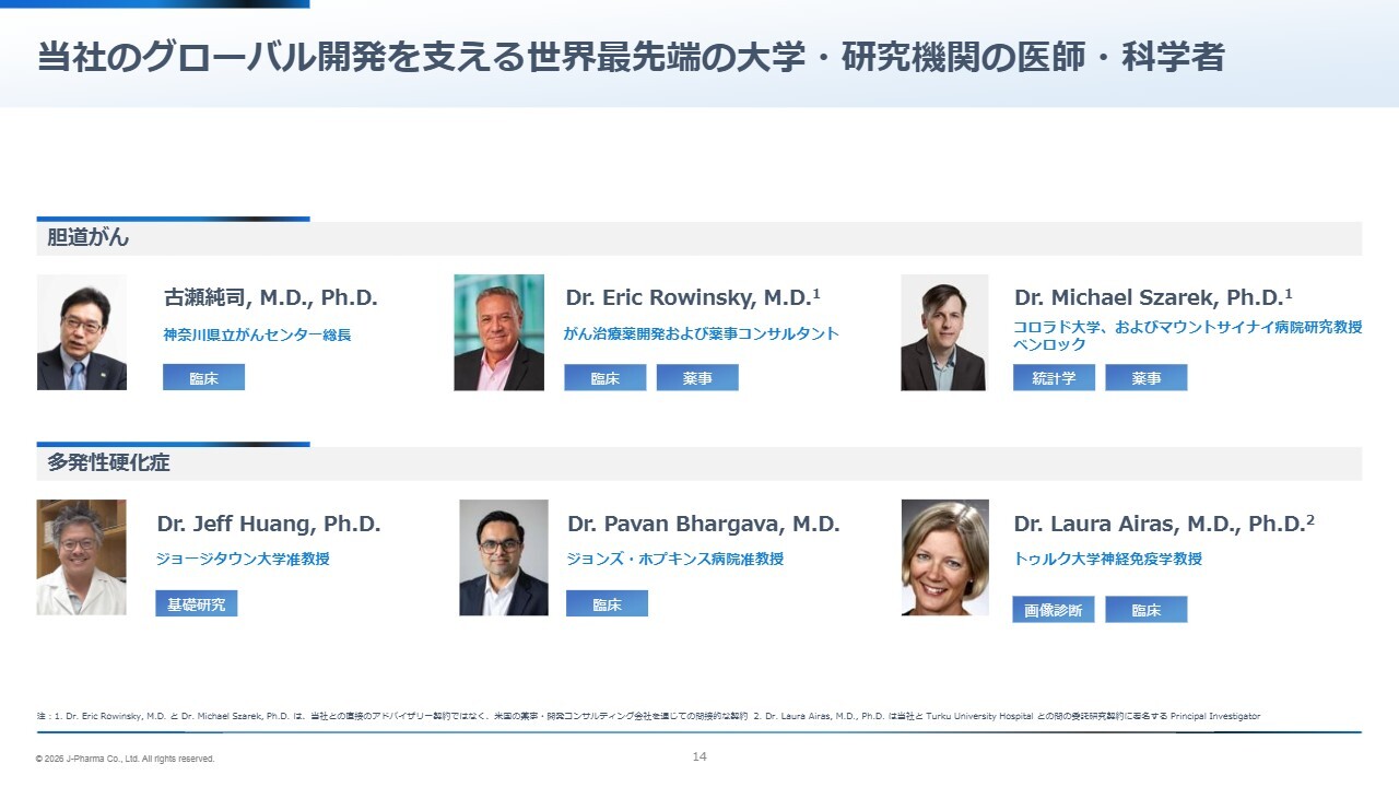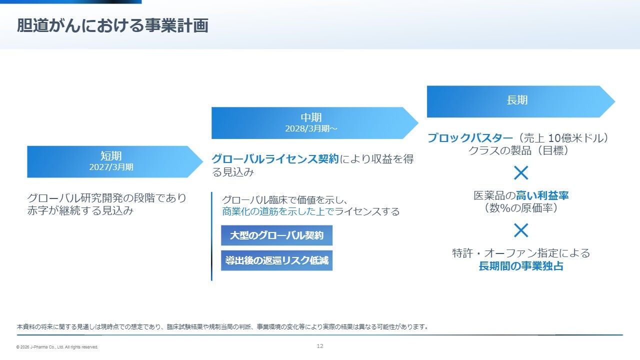 回答:現在、当社では、「ナンブランラト」のグローバル第3相試験、および2剤目である「JPH034」の米国第1相試験の2本の臨床試験を進めています。加えて、「ナンブランラト」については、胆道がん一次療法を対象に、免疫チェックポイント阻害剤との併用療法を評価する国内の医師主導試験も、まもなく開始される見込みです。今後2年間は、これら3本の臨床試験に重点的に投資し、グローバル水準の臨床データを蓄積することで、各化合物の価値向上を図っていきます。そのうえで、ライセンス契約を通じた事業化の実現を目指しています。