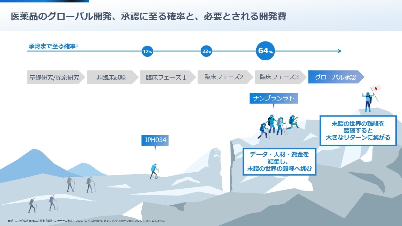 エベレストやK2といった世界の頂を目指すような挑戦として、私どもは新しく優れた薬を世界中の人々に届けることを目指しています。必要な兵站を整え、臨床フェーズにおける最初の段階である「臨床フェーズ1」に進んでいきます。