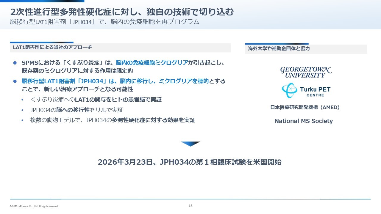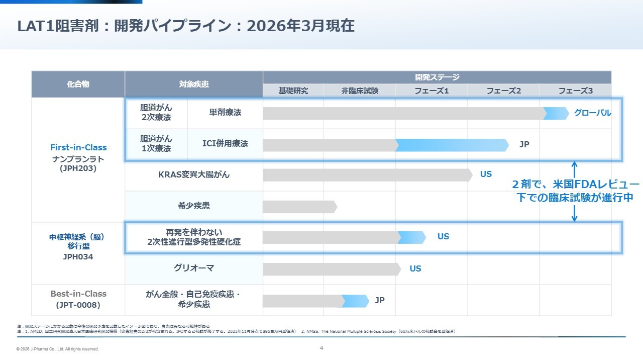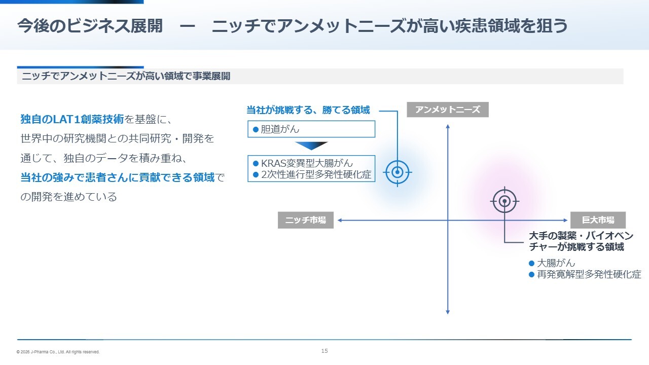 例えば当社が取り組んでいる領域としては、胆道がん、多発性硬化症の中でも二次性進行型、そして大腸がんの中でもKRAS変異型などが挙げられます。これらはいずれも既存治療の選択肢が限られている一方で、LAT1阻害剤の有効性や可能性が科学的に示されている領域です。