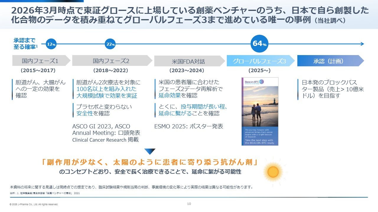 先ほど「珍しい」とおっしゃっていただいたように、東証グロース市場に上場する企業の中で、自社で創製した医薬品をグローバルフェーズ3まで進めているのは私どもだけです。