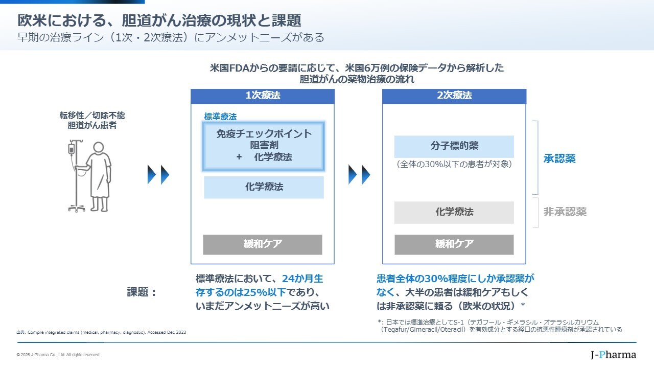 胆道がん治療においてアンメット・メディカル・ニーズが最も高いのは、2次療法で使用できる薬剤が存在しない、約70パーセントの患者さまだと考えています。私どもは、そのような患者さまに福音を届けるべく、現在グローバルフェーズ3試験を展開しています。