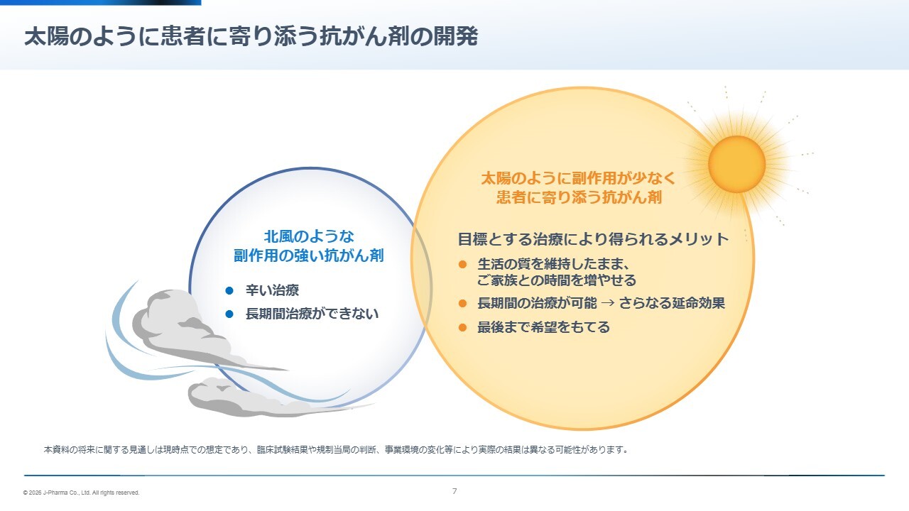 「太陽のように副作用が少なく患者さまに寄り添う」という新しいコンセプトを持つ抗がん剤を、グローバルのフェーズ3において立証していきたいと考えています。