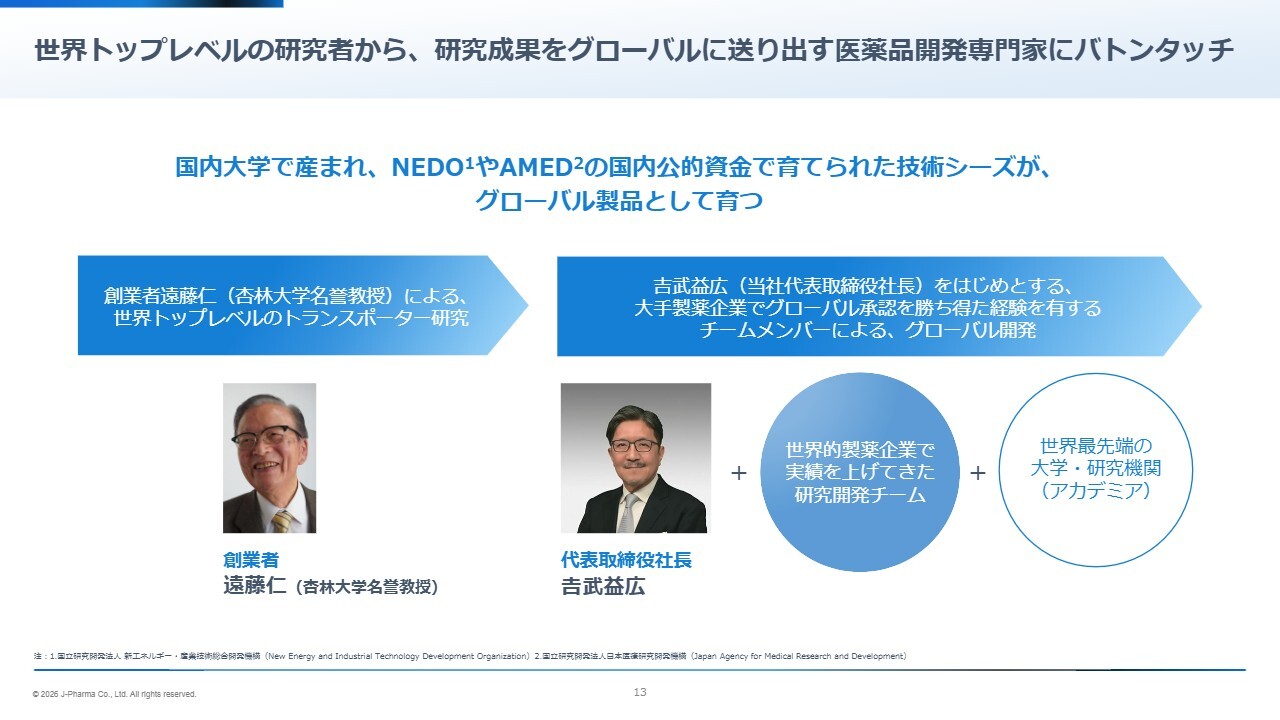 遠藤という世界的レベルの科学者が、NEDOやAMEDなどの日本の公的資金によってキラリと光るダイヤモンドの原石を見つけ出しました。その後、私がそのプロジェクトに参画し、医薬品のグローバル開発に携わるさまざまな専門家を集め、ダイヤモンドとなり得ることを確認しました。