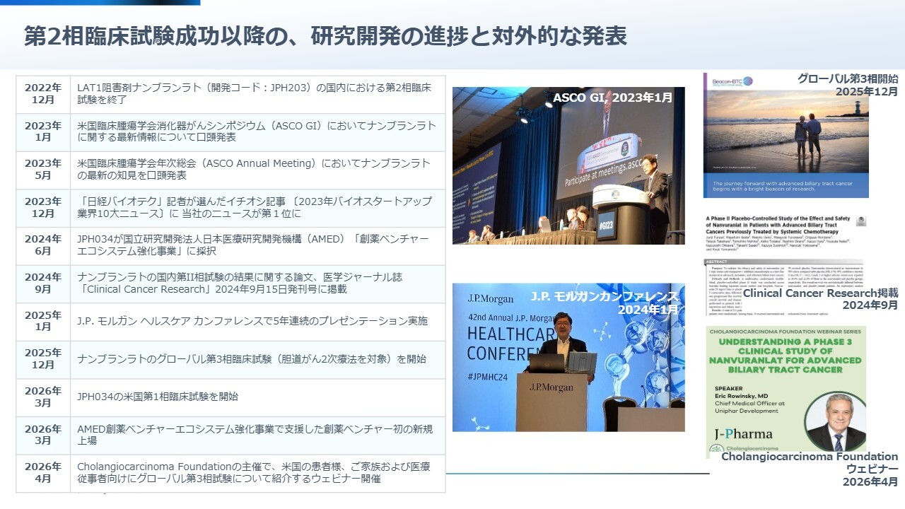 例えば、フェーズ2試験は2022年12月に完了しました。その直後、2023年1月にはASCOの消化器シンポジウム(GI)で、神奈川県立がんセンターの古瀬総長による口頭発表が行われました。