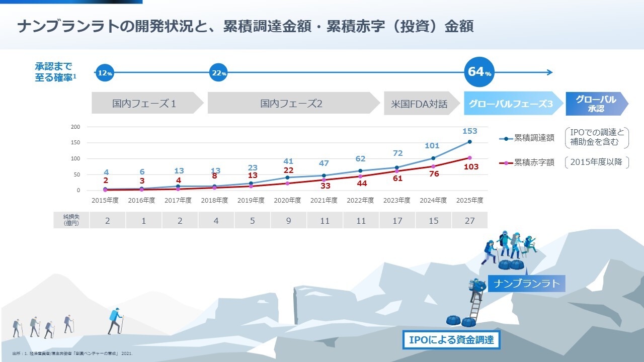 ナンブランラトの開発状況と、累積調達金額・累積赤字(投資)金額