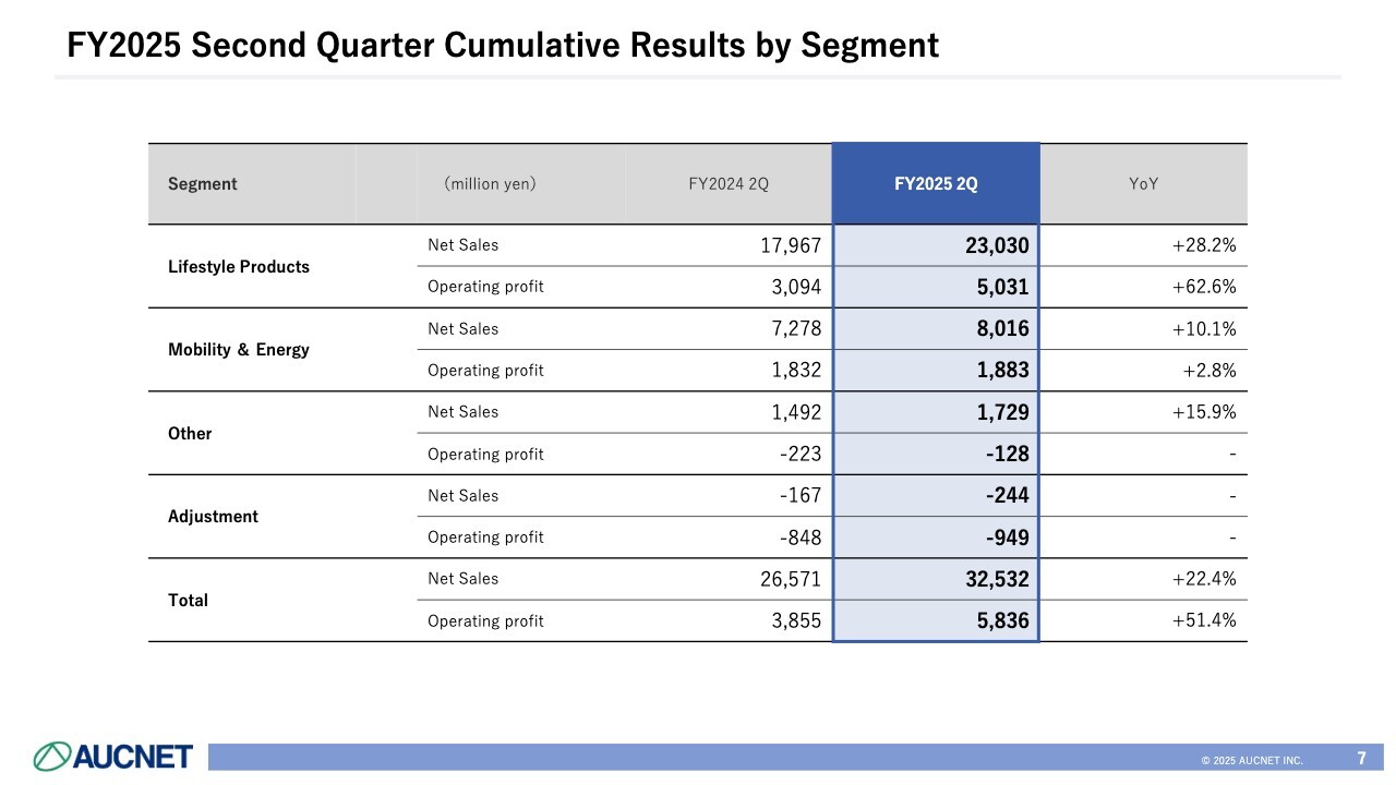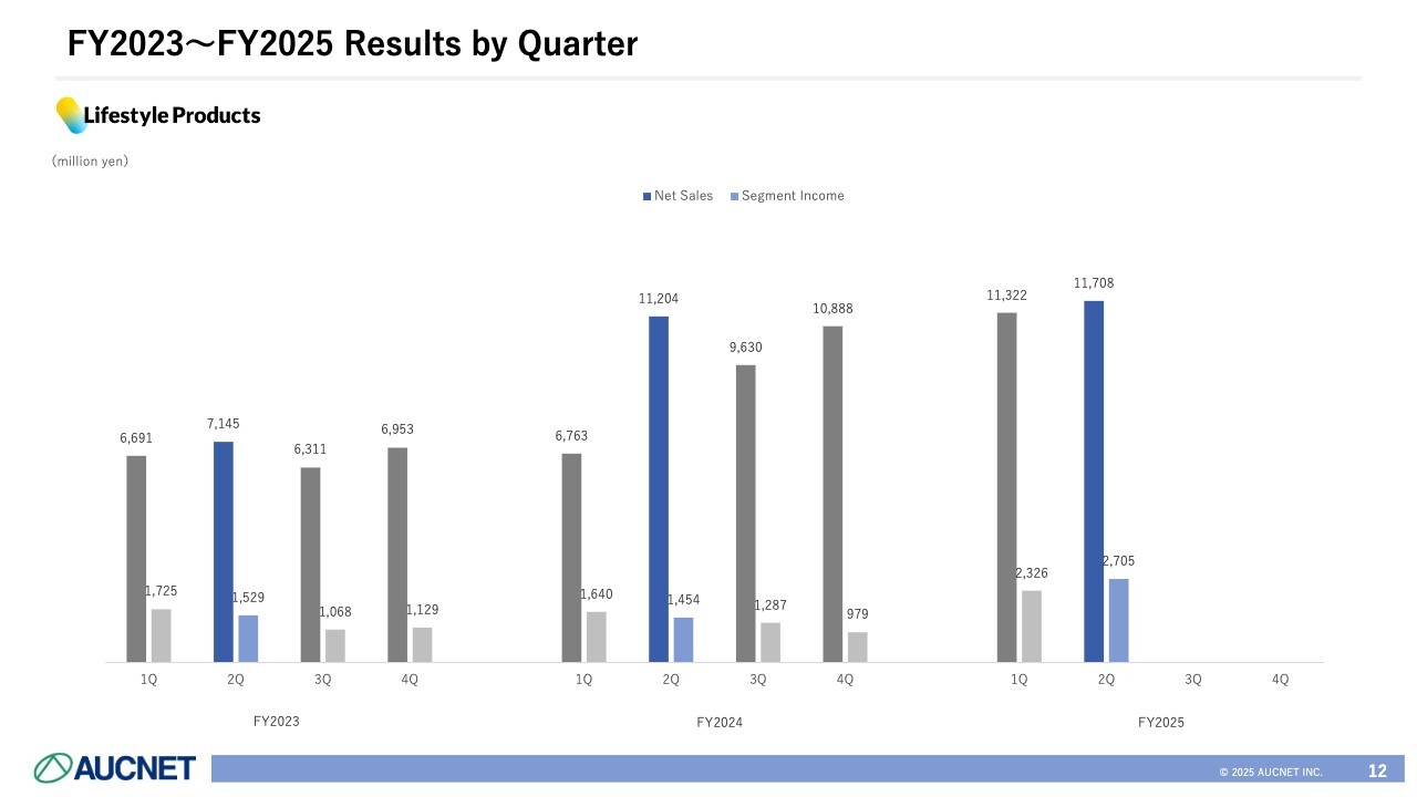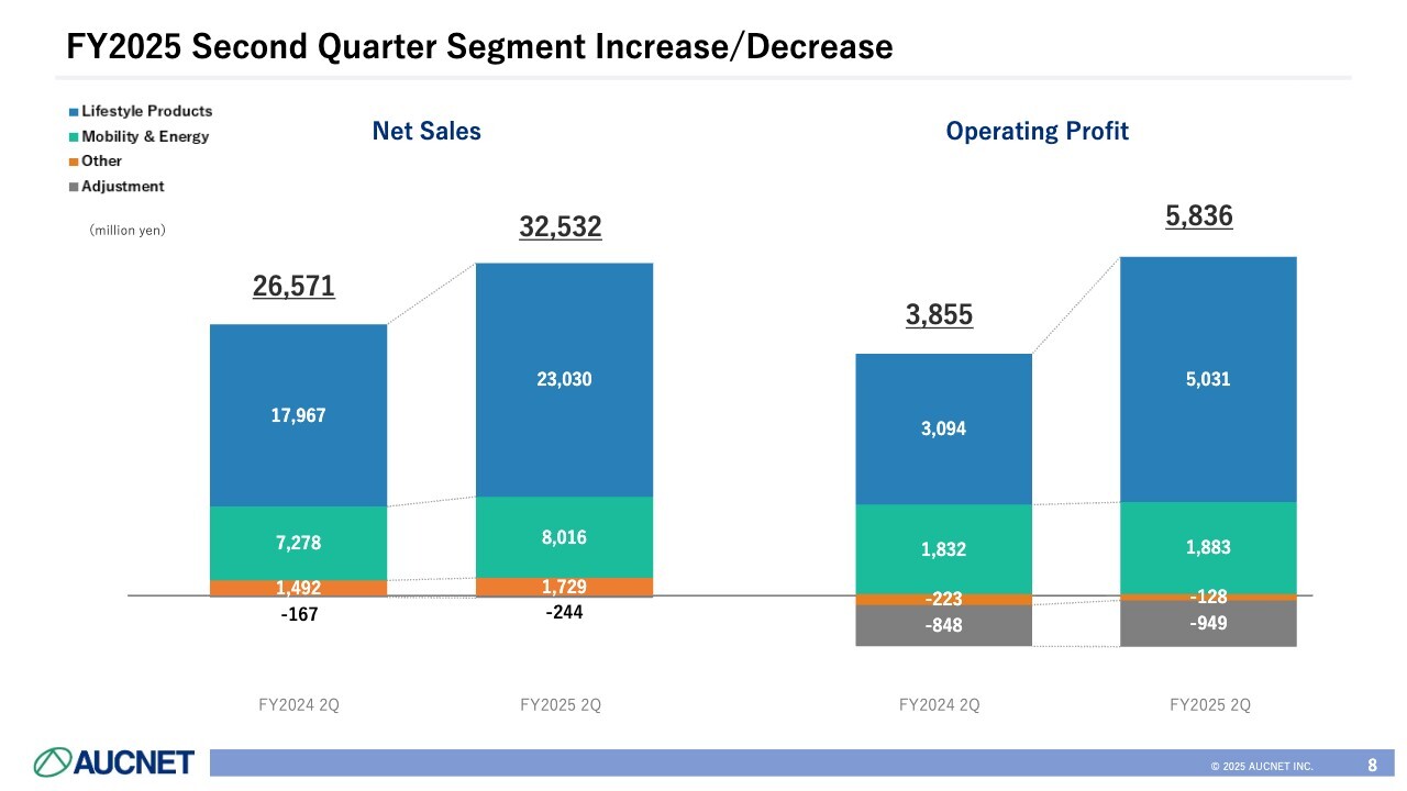 The figures by segment are shown at the bottom of the slide. Focusing on profit, Lifestyle Products performed strongly, posting segment income of 2,705 million yen, up 86.0% year on year. In contrast, Mobility & Energy recorded segment income of 775 million yen, down 12.8% year on year.