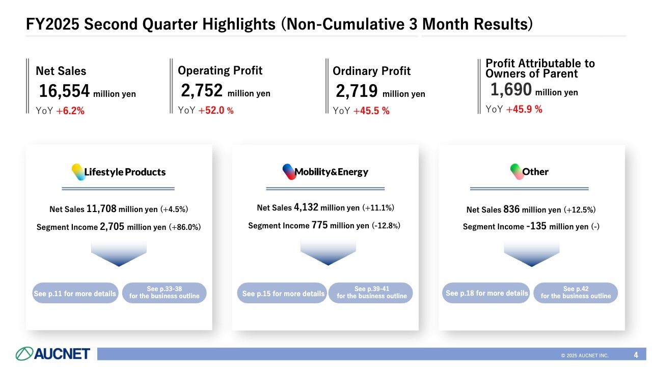 Here are the highlights for the second quarter alone. Overall, we delivered very strong results, with net sales of 16,554 million yen, up 6.2% year on year; operating profit of 2,752 million yen, up 52.0% year on year; ordinary profit of 2,719 million yen, up 45.5% year on year; and profit attributable to owners of parent of 1,690 million yen, up 45.9% year on year.