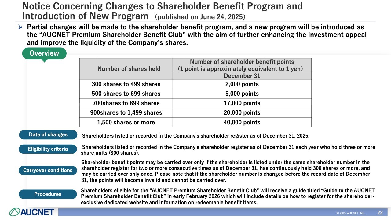 The third topic is the notice concerning changes to the shareholder benefit program and the introduction of a new program, disclosed on June 24. To enhance the attractiveness of investment in the Company’s shares and improve trading liquidity, the contents of the shareholder benefit program have been revised, and a new program called the “AUCNET Premium Shareholder Benefit Club” has been introduced.