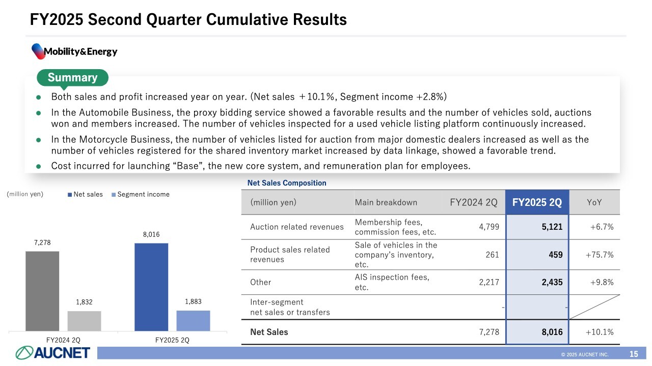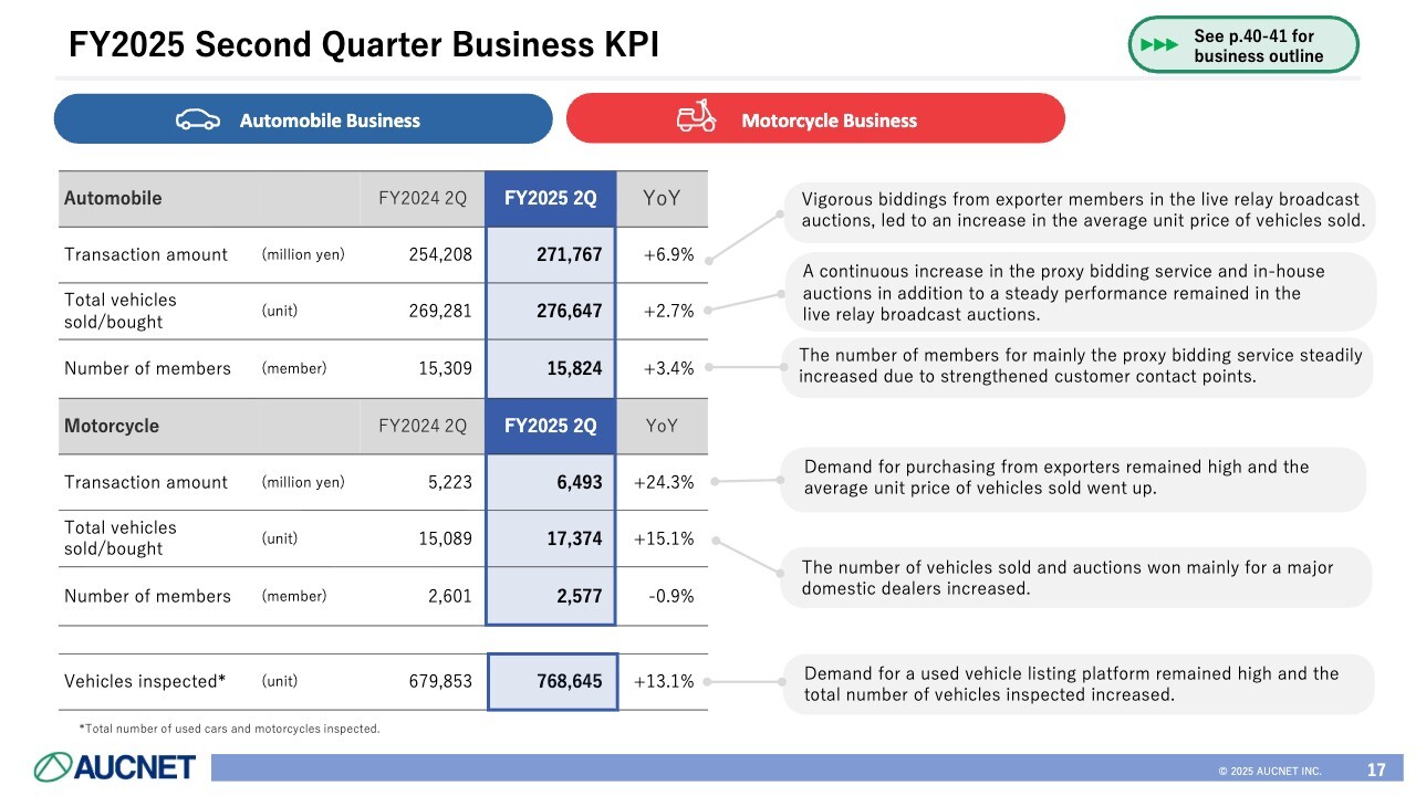 In the Motorcycle Business, which handles used motorcycles, we strengthened partnerships with major domestic dealerships. This led to more auction listings and higher registrations in the shared inventory market through data integration. Although smaller in scale compared with the Automobile Business, this segment also continued to perform well.