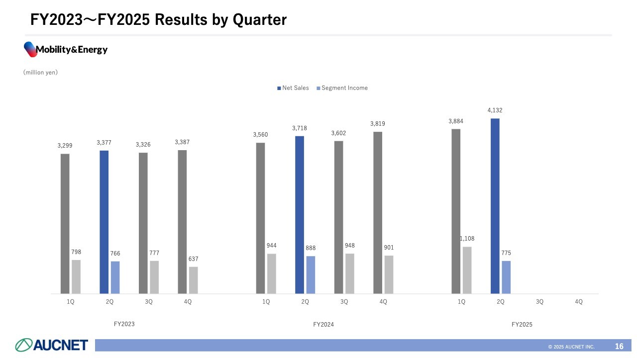 This slide shows quarterly performance of the segment. In Mobility & Energy, most sales come from commission fees, so net sales have been steadily increasing.