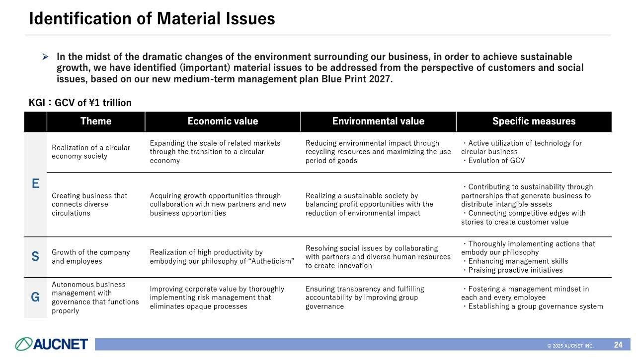 Lastly, I would like to address sustainability. In recent years, greater disclosure of materiality has been required, and we would like to summarize and share the initiatives we can undertake in this area.