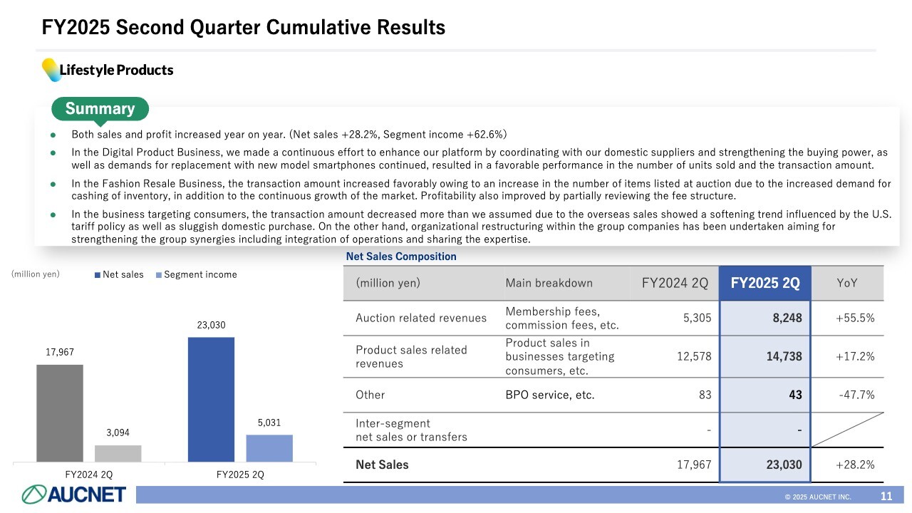 Let me now explain the details by segment. Lifestyle Products achieved year-on-year growth in both sales and profit, with net sales up 28.2% and segment income up 62.6%.