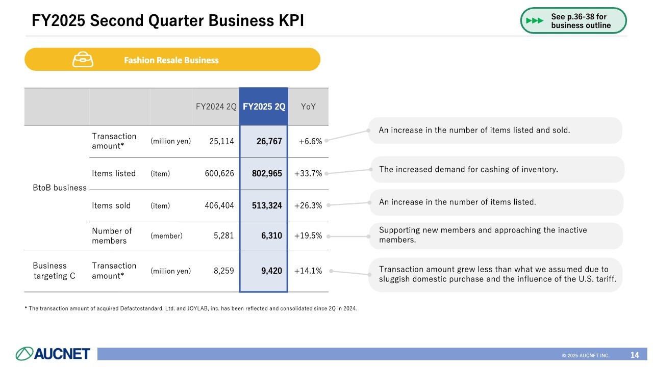 The transaction amount for the business targeting consumers reached 9,420 million yen, up 14.1% year on year. Even so, we are facing some challenges in purchasing, and sales have also been partially affected by tariffs and international developments. We intend to take active measures to address these issues.