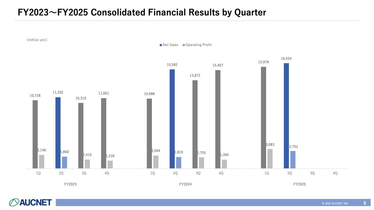 This graph shows quarterly changes in consolidated financial results. As indicated, net sales began to increase significantly in the second quarter of FY2024. This is because Defactostandard, Ltd. and JOYLAB, inc., which we acquired last year, were consolidated in the second quarter of that year.