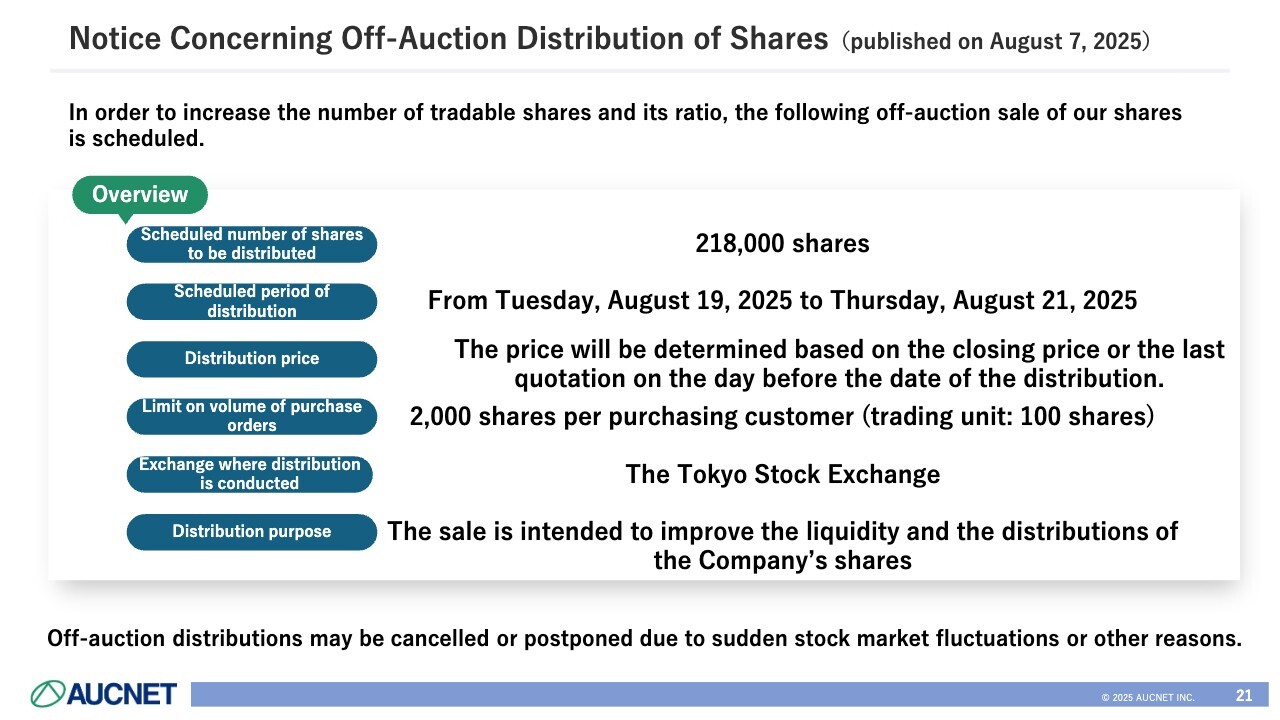 The second topic is the notice concerning the off-auction distribution of shares. The Company plans to conduct the distribution of shares with the aim of improving the trading liquidity. The number of shares to be distributed is 218,000 shares, and the distribution is scheduled to take place between August 19 and August 21. The distribution price will, in principle, be determined based on the closing price or the final quoted price on the business day prior to the distribution date.