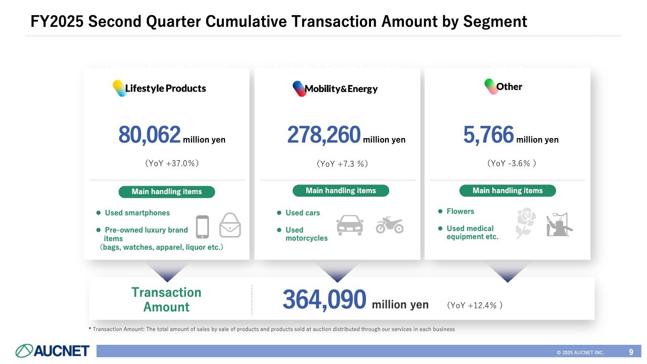 Regarding business KPIs, the Automobile Business recorded a transaction amount of 271.7 billion yen, driven by active bidding from exporters in live relay broadcast auctions and an increase in the average unit price of vehicles sold.
