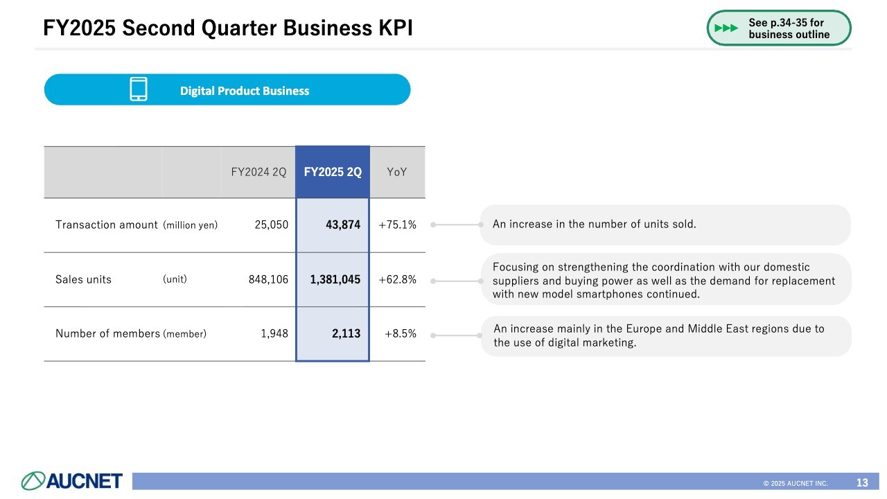 Let me now explain the KPIs. The transaction amount for the Digital Products Business was 43,874 million yen, driven by an increase in the number of sales units.