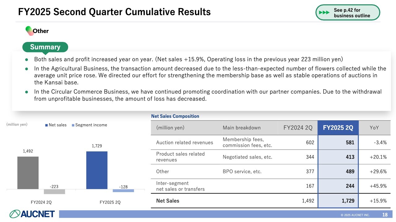 As for Other, both sales and profit increased year on year, with net sales up 15.9%. The segment recorded an operating loss of 128 million yen.
