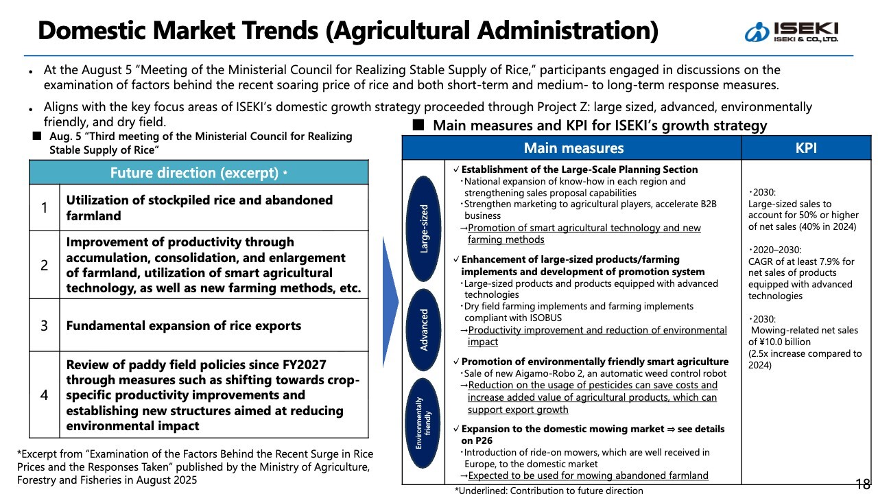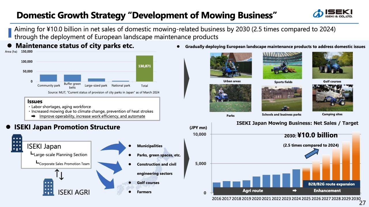 I will explain the development of our mowing business here. As part of our domestic growth strategy, we will strengthen the development of our mowing business. We have traditionally offered mowing products in the domestic agricultural sector. Going forward, we will fully enter the domestic landscape maintenance market, focusing on our well-regarded ride-on mowers in Europe. We aim to increase domestic mowing-related net sales to ¥10.0 billion by 2030, a 2.5 times increase compared to 2024.