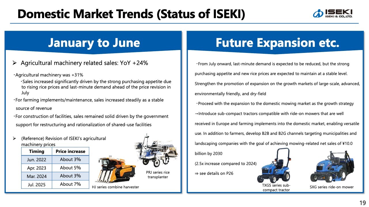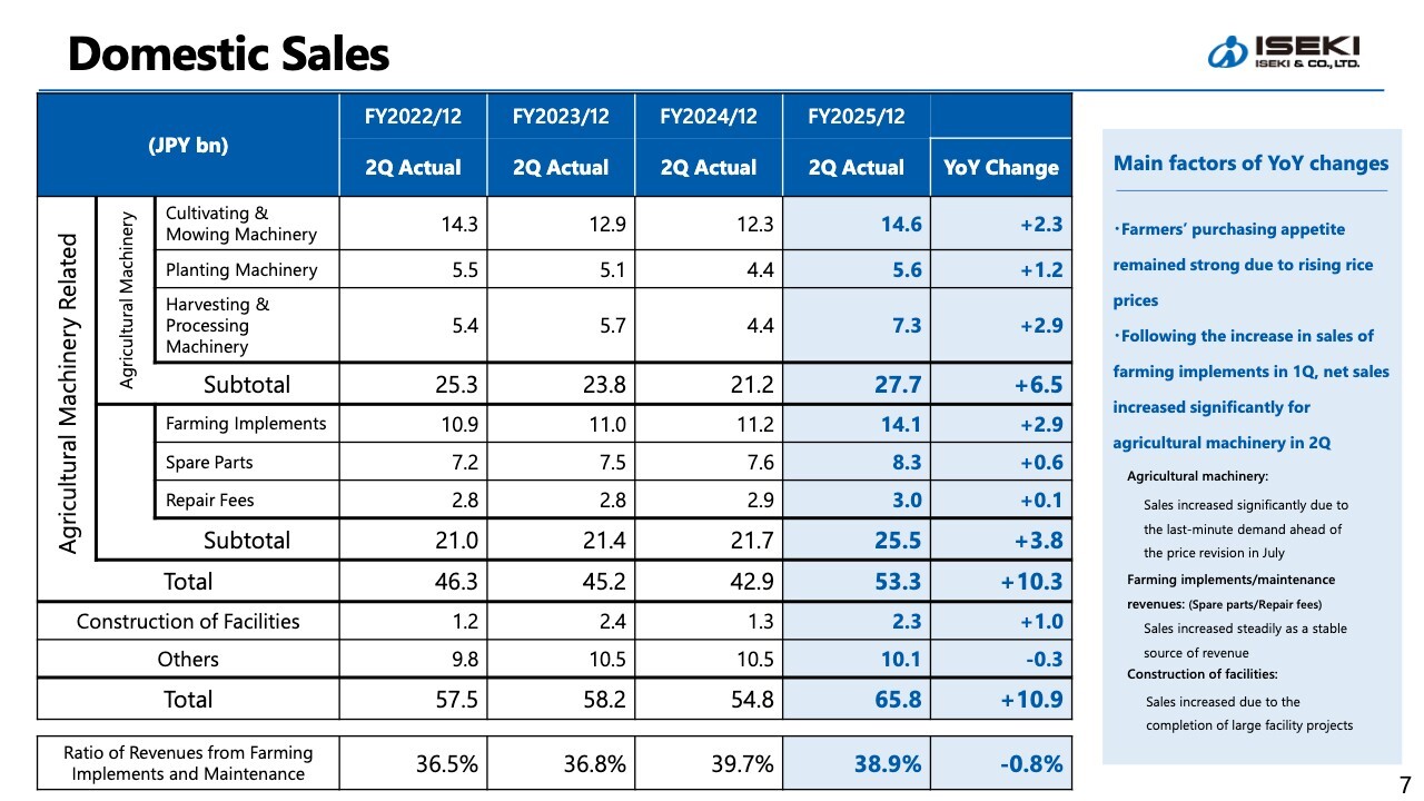 This slide shows the status of domestic sales. As indicated in the total column of the table on the slide, net sales increased by ¥10.9 billion YoY. For agricultural machinery—specifically those manufactured and sold by ISEKI—sales increased by ¥6.5 billion. This growth was driven by the continued strong purchasing appetite of farmers, resulting from rising rice prices, coupled with last-minute demand ahead of the price revision in July.