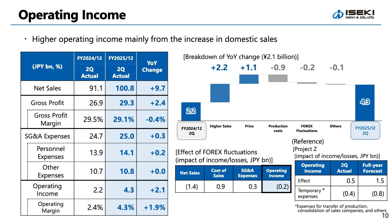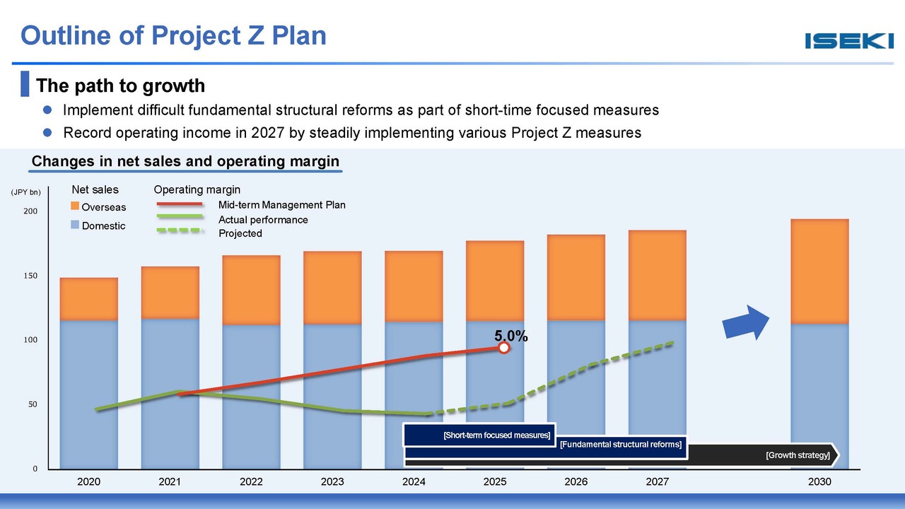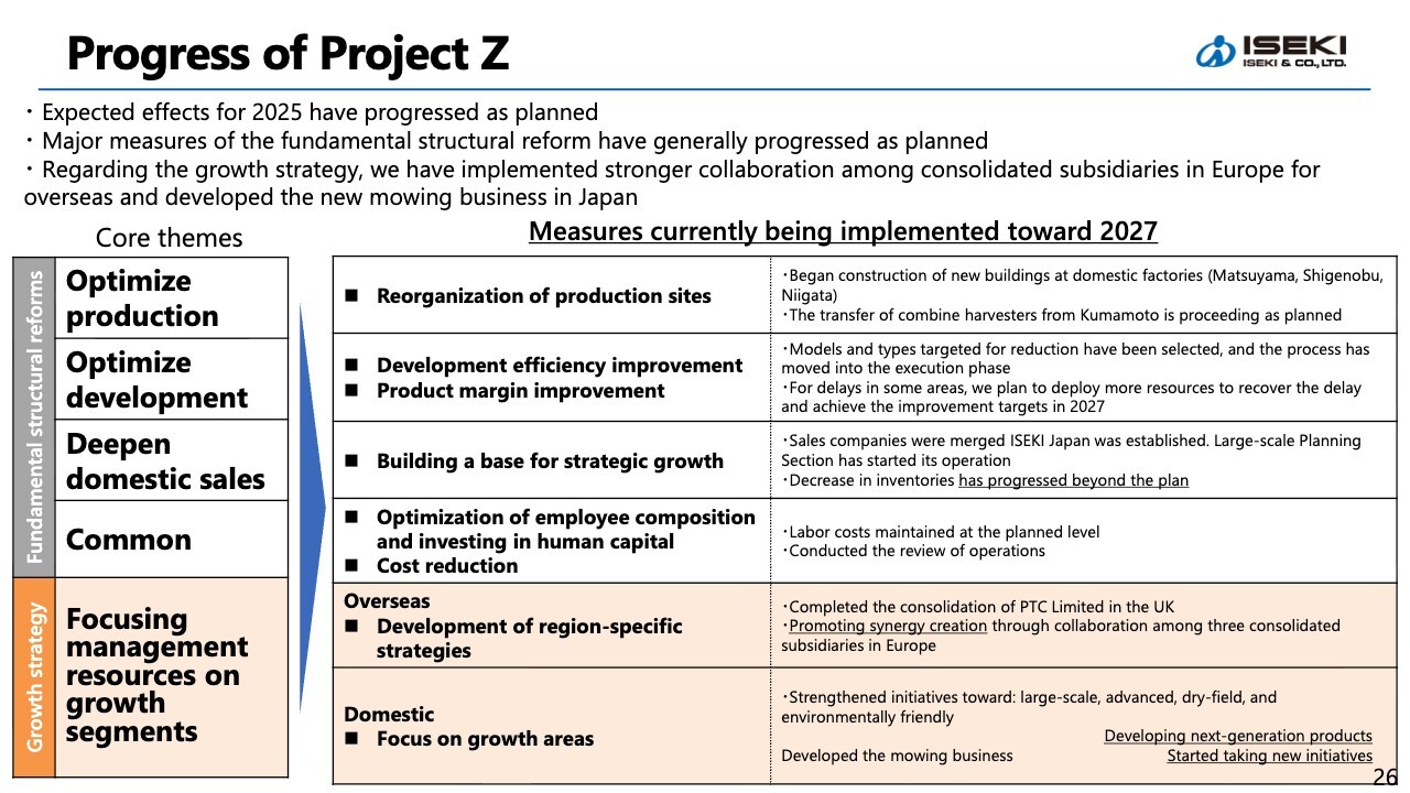 During the period, the effects of Project Z measures remain minimal. Meanwhile, this period includes merger costs for distributor ISEKI Japan and temporary expenses related to the transfer of production from Kumamoto Factory to Matsuyama Factory.