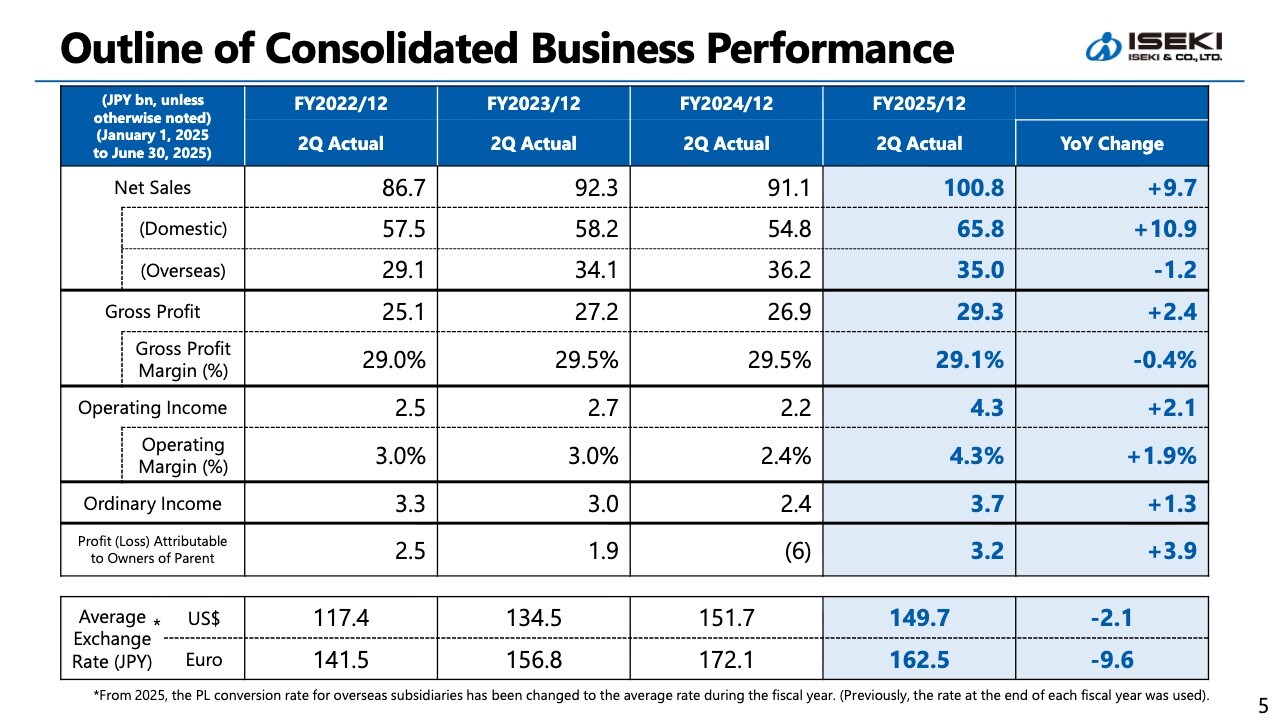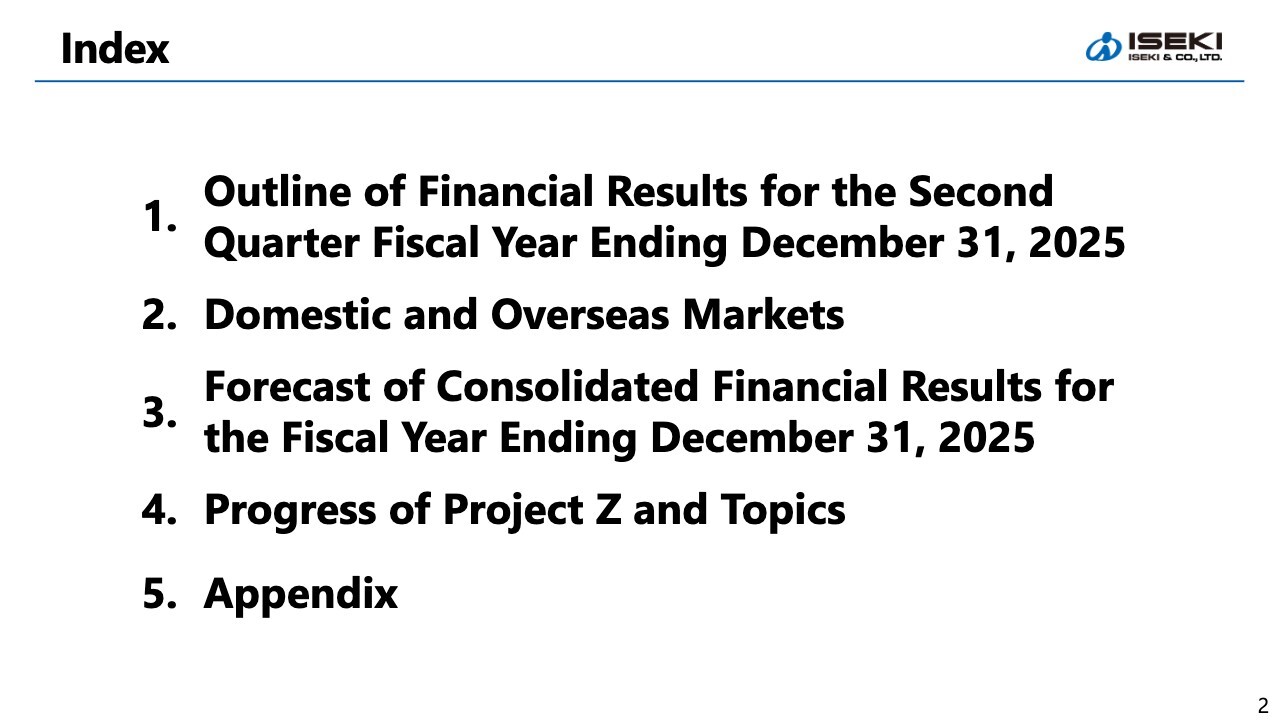 Shiro Tomiyasu (hereafter, Tomiyasu): Hello everyone. I am Shiro Tomiyasu, President and Representative Director, ISEKI & CO., LTD. Thank you for attending our financial results briefing for 2Q FY12/2025. We truly appreciate your continued support and valuable feedback on our investor relations efforts. Today's briefing will proceed as outlined on this slide.