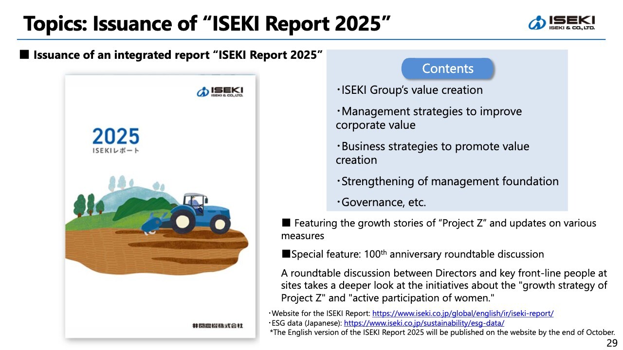The second topic is the issuance of our integrated report, ISEKI Report 2025. This report features the growth stories of Project Z and various measures, including my message, an explanation from Odagiri, the leader of Project Z, and further details from each general division manager.