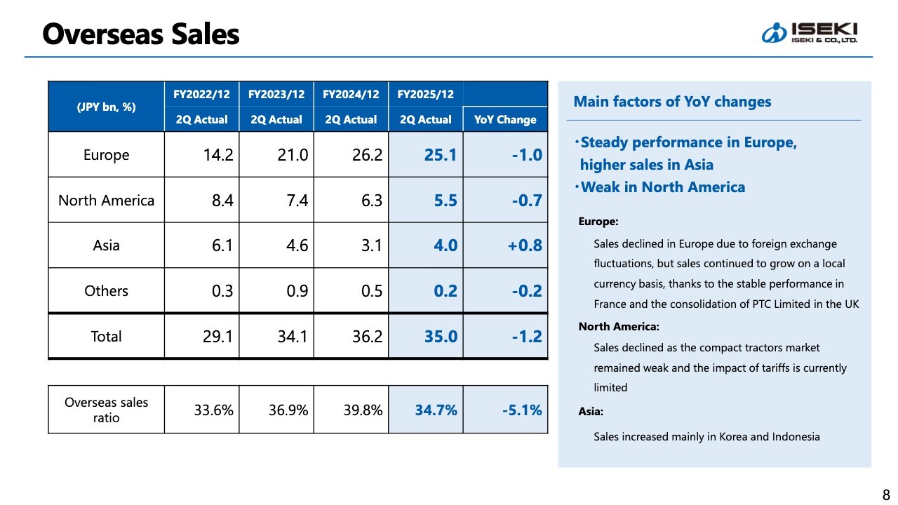 Next, overseas. As shown in the total column on the slide, sales declined by ¥1.2 billion YoY. However, sales increased on a local currency basis. While in Europe, sales declined due to foreign exchange fluctuations, stable performance continued in France. In addition, the consolidation of PREMIUM TURF-CARE Ltd. (PTC) in the U.K. since January contributed to continued growth on a local currency basis.