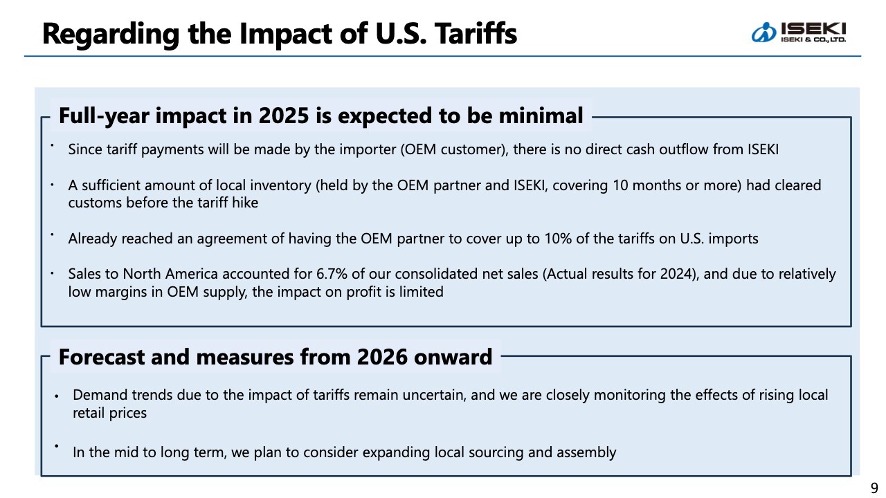 Next, I will explain the impact of U.S. tariffs. We continue to view the full-year impact for FY12/2025 as minimal. We bear no tariff burden. Furthermore, because a certain amount of local inventory cleared customs before the tariff hike, we believe the impact on local sales will be limited.
