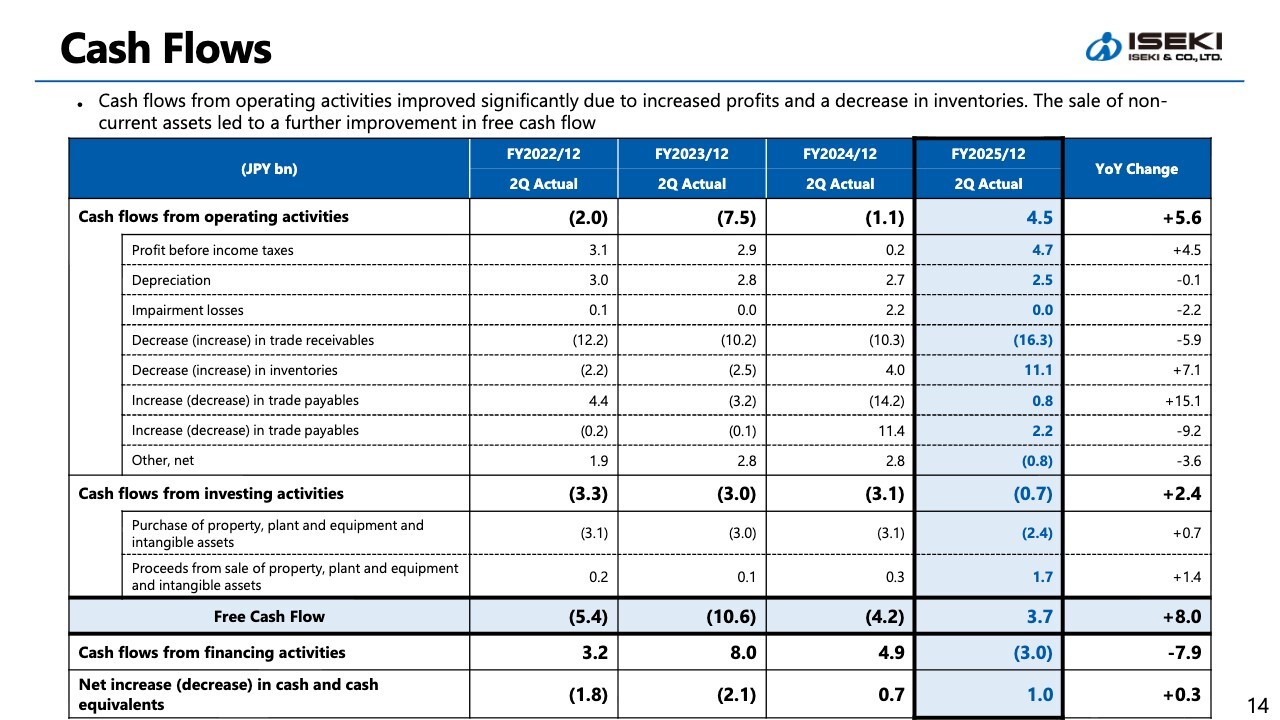 This slide summarizes cash flows. As shown in the upper section of the slide, cash flow from operating activities turned positive due to the recognition of interim profit and the reduction of inventories. As explained earlier, we expect the collection of trade receivables to progress further from July onward, leading to an expansion of positive cash flow from operating activities for the full year.