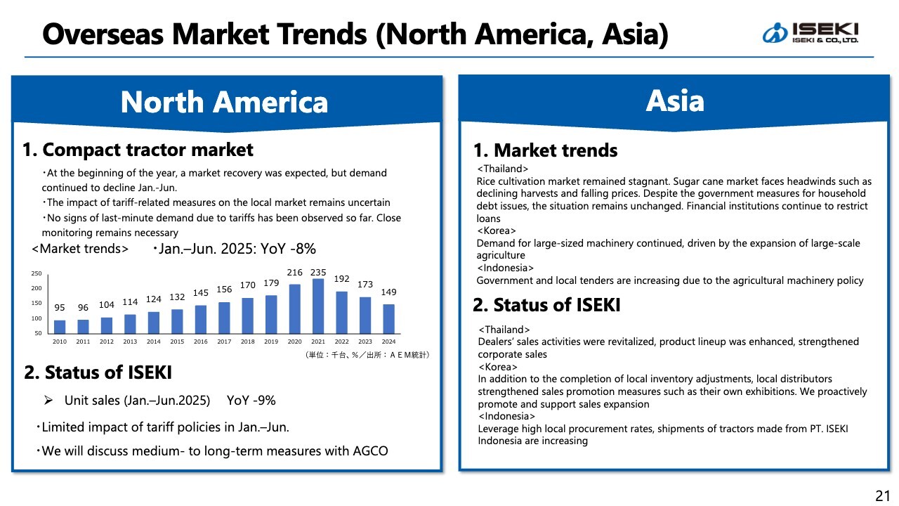 Next are trends in North America and Asia. In North America, within the compact tractor market where we primarily supply tractors below 40 horsepower, sales volume decreased by 8% YoY, with our unit sales down 9%, in line with the overall market decline during the January to June period.