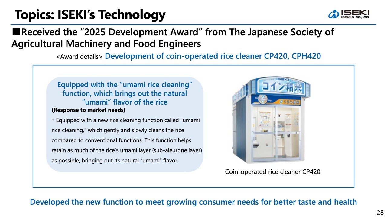 Let me introduce two topics. The first is our coin-operated rice cleaners. A newly redesigned model, launched as a new product, received the “2025 Development Award” from the Japanese Society of Agricultural Machinery and Food Engineers. Responding to growing consumer demand for taste and health benefits in recent years, it features an “umami rice cleaning” function that enhances the inherent “umami” flavor of rice.