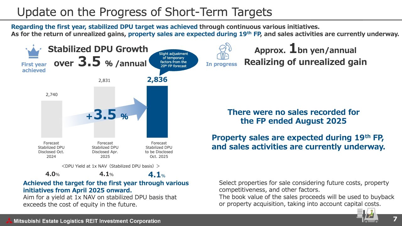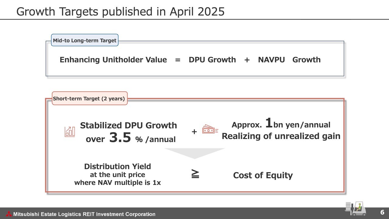 Here I would like to discuss the progress we are making toward the short-term goals we have set for April 2025. MEL has set stabilized DPU growth of 3.5% or more per year and the return of approximately 1 billion yen in unrealized gains over the next two years as short-term goals.